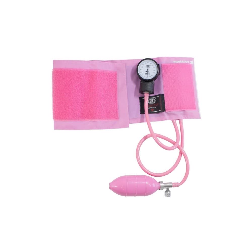 O Esfigmomanômetro Aneróide Bic (aparelho de pressão) é verificado e aprovado pelo INMETRO, possui manguito e pêra em PVC, braçadeira em Nylon (na cor rosa) e fecho de Velcro.
