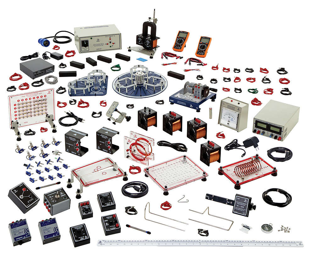 Destinado ao estudo e medições em circuitos elétricos, corrente elétrica, potência elétrica, diferença de potencial, resistência elétrica, resistores, lei de Ohm, resistor ôhmico e resistor não ôhmico, ponte de Wheatstone, associação de resistores em série, em paralelo e mista, potenciômetro, diodo, lei das malhas e dos nós de Kirchhoff, associação de capacitores em série e em paralelo, campo magnético terrestre, polos magnéticos, linhas de campo, experimento de Oersted, lei de Lenz, lei de Faraday-Neumann, indução magnética e eletromagnética, solenóide, bobina de Helmholtz, motor elétrico monofásico e trifásico, gerador elétrico CC e CA, etc.
