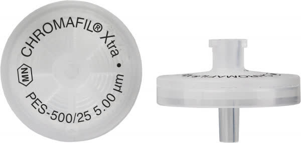 Filtro p/seringa CHROMAFIL XTRA em PES (polietersulfona), carcaça em PP, diâmetro de 25mm, poro de 5µm, caixa c/100 peças