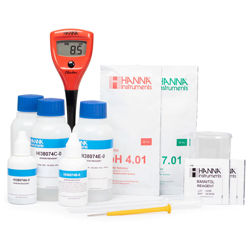 O HI38074 é um teste kit químico de titulação que determina a concentração de boro em águas de irrigação numa faixa de 0 a 5 mg/L (ppm). O HI38074 acompanha todos os reagentes e equipamentos necessários para realização de análises, incluindo o medidor de pH Checker HI98103. O medidor de pH Checker HI98103 é usado para preparação da amostra e para a determinação do pH no endpoint. O HI38074 contém reagentes suficientes para realização de 100 testes.