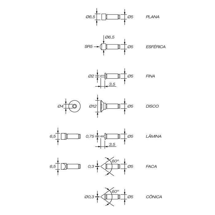 Acompanha 7 pares de pontas de diferentes tipos para se adaptar a diversos tipos de medições. Fornecidos nas capacidades de 0-25mm até 175-200mm.