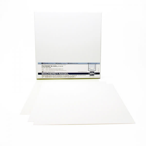 Cromatoplaca de poliester p/TLC POLYGRAM SIL N-HR(Sílica Gel 60 c/alta pureza e alto conteúdo de gesso), c/indicador UV254, dimensões de 20x20cm, espessura de 0,20mm, caixa c/25 peças