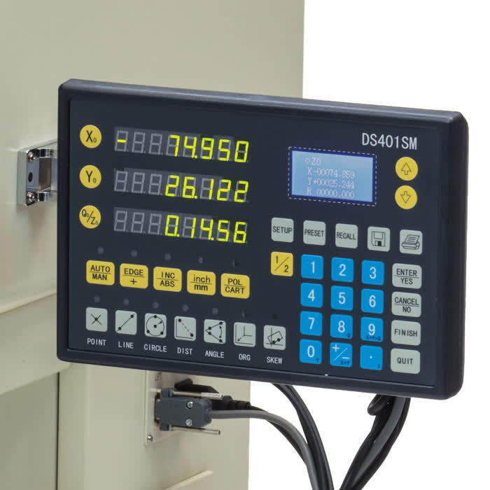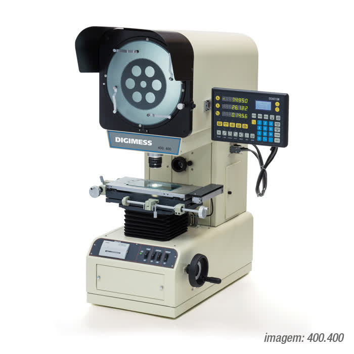 Possui unidade de leitura digital incorporada sem nenhum custo adicional. Permite medições simples de linha, distâncias, raios, ângulos, entre outros. Acompanha objetiva para ampliação de 10x. Erro de aumento da objetiva menor que 0,08%. Mesa de coordenadas com deslocamento de 150x50mm.
