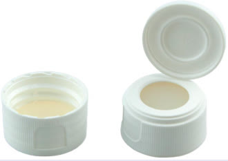 Tampa rosca N24 branca, c/abertura central e tampa de proteção removível, septo c/espessura de 3,2mm em silicone(natural)/teflon(incolor), caixa c/100 peças